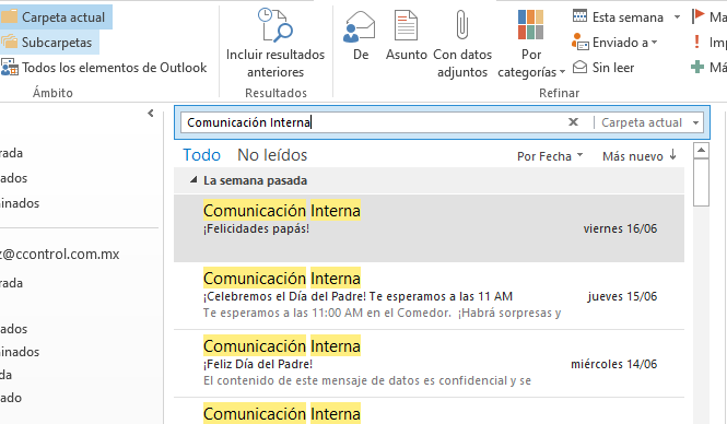 - Selecciona una opción para mejorar tu búsqueda: Todos los buzones, Buzón actual, Carpeta actual, Subcarpeta o Todos los elementos de Outlook.