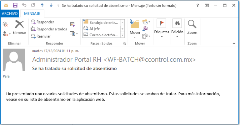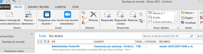 Una vez que tu jefe haya autorizado tus vacaciones, a ti te llegará un correo electrónico de parte de “Administrador Portal RH” notificándote al respecto.