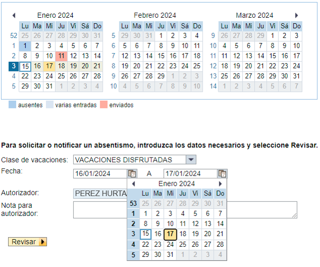 Se abrirá un calendario. En la parte inferior haz clic en “Fecha” y selecciona el día en que inician y el día en que terminan tus vacaciones. Posteriormente, haz clic en el recuadro “Revisar” para que le llegue tu solicitud a tu jefe inmediato, quien deberá autorizarlas también por medio del Portal SAP.