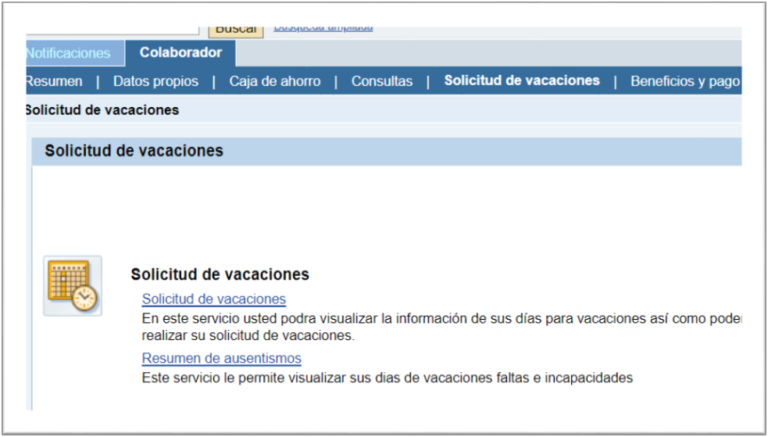 Elige el submenú “Solicitud de vacaciones” y después la opción que lleva el mismo nombre.