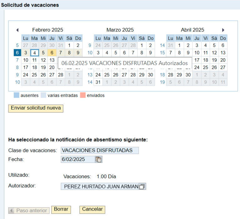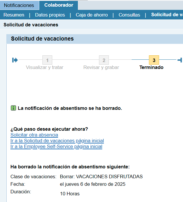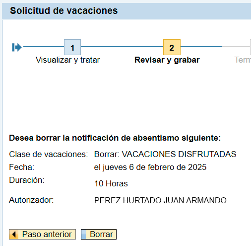 Por último, el sistema te informará que tu solicitud ha sido borrada. Si lo requieres podrás hacer una nueva solicitud de vacaciones.